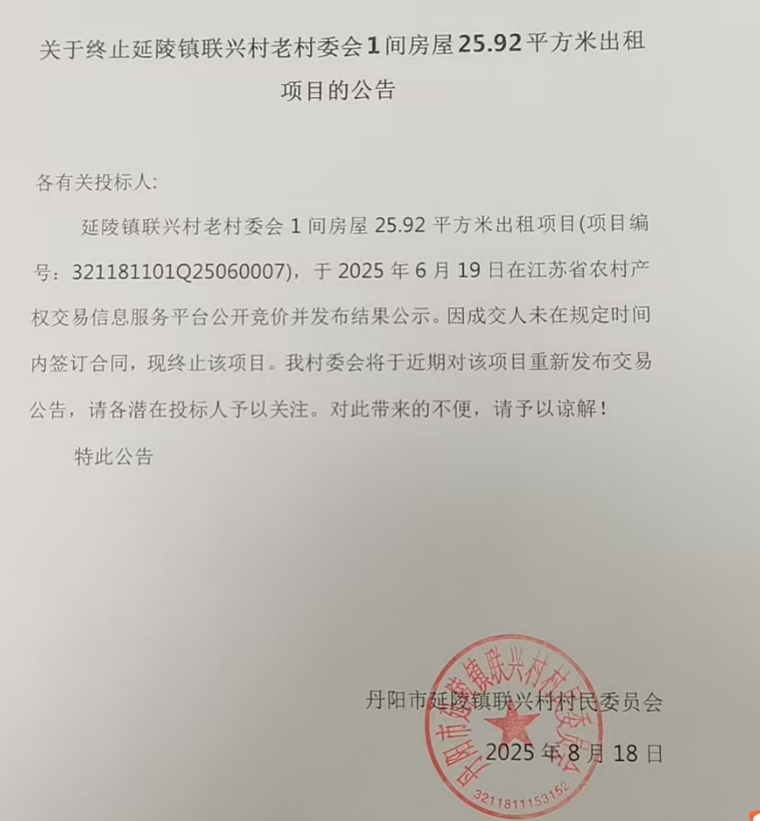 延陵镇联兴村老村委会1间房屋25.92平方米出租项目(项目编号:321181101Q25060007),于2025年6月19日在江苏省农村产权交易信息服务平台公开竞价并发布结果公示。因成交人未在规定时间内签订合同,现终止该项目。我村委会将于近期对该项目重新发布交易公告,请各潜在投标人予以关注。对此带来的不便,请予以谅解!