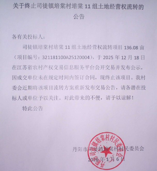 司徒镇培棠村培棠11组土地经营权流转项目136.08亩(项目编号:321181100A25120004),于2025年12月18日在江苏省农村产权交易信息服务平台公开交易并发布公示,因成交单位未在规定时间内签订合同,现终止该项目。我村委会近期将该项目流转方案重新发布交易公告,请各潜在投标人或单位予以关注。对此带来的不便,请予以谅解!
